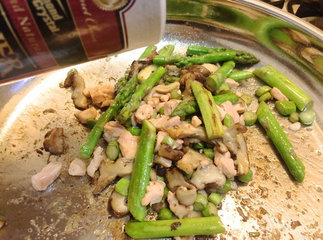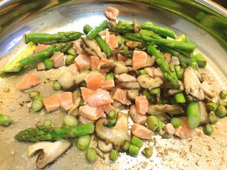 3 、热锅加入奶油,依序加入芦笋段、芦笋丁、香菇、鲑鱼,并将所有料炒熟。