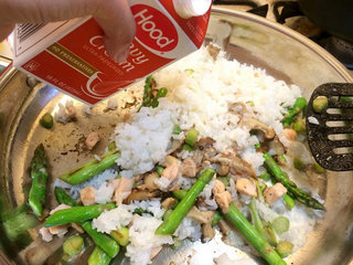 5 、加入煮熟的白饭,并倒入适量鲜奶油与炒好的食材拌匀。依个人口味再次加入盐巴、烹大师、义大利香料。