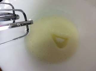 1、蛋白与蛋黄黄分开.....将蛋白用电动搅拌器搅打至粗泡后。