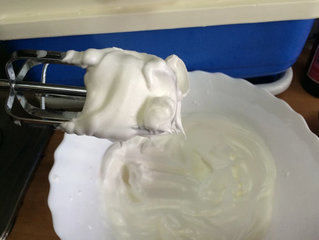 2 、糖分3次加入....打到蛋白有光泽,末端呈坚挺的状态..拿起来有小勾勾。