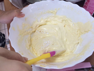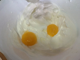 3 、加入...蛋黄..轻轻搅拌...不要让蛋白消泡。