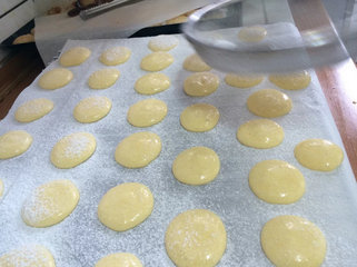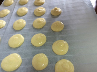 5 、搅拌均匀后...放入挤花袋中....挤花头..用平口...挤在...铺好的烘培纸上...每一个都需要有距离..才不会烤时黏在一起。