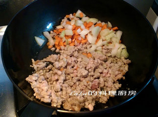 2 、起锅将绞肉煸炒出油(如果绞肉偏瘦可以加些炒菜油比较好煸炒), 放入蒜末和糖续炒,陆续加入洋葱和红萝卜一起炒。