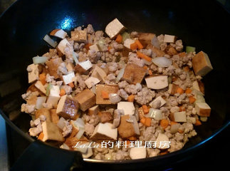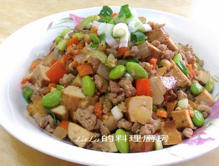 主料:绞肉400克,豆干3块,熟毛豆仁适量,红萝卜适量,洋葱半颗,酱油2大匙