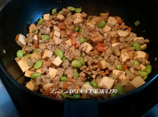 4 、炒至汤汁收干,加入毛豆仁和辣椒拌一下,试一下味道做最后调味, 起锅前洒些胡椒粉和葱花拌炒一下即可熄火。