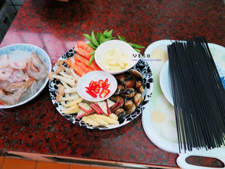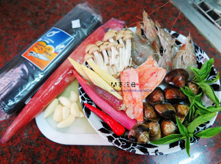 主料:鲜虾4只,蛤蜊10颗,蟹肉棒5根,鸿喜菇一小把,玉米笋2根,秋葵2根,墨鱼面2人份,小卷半只