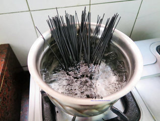 3、煮一锅滚水放入一小匙盐,再放入墨鱼面煮约 7-8分。