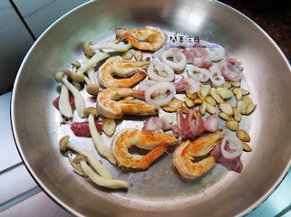 4、放橄榄油小火先炒香蒜片,再放入虾、小、鸿喜菇。