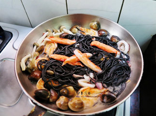 7、大功告成,义式塔香海鲜墨鱼面完成!