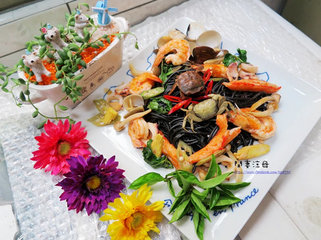 海鲜墨鱼面,六月中旬的太阳好大, 热风呼呼的吹来, 大人、小孩的胃口都不好, 突然想吃可口的海鲜墨鱼面, 早上就到市场选购海鲜, 准备回家煮个丰富的义式墨鱼面, 轻爽料多味美, 果然很受大家好评哦。
