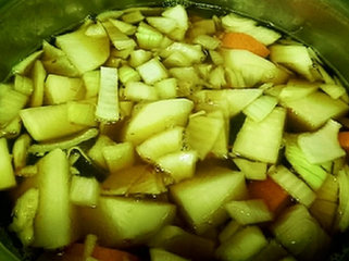 2 、把所有的蔬菜切块状加入2500cc的水量 及所有的调味料放入等水滚后再放入牛腩。