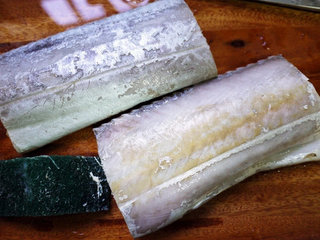 1、煎白带鱼之前,要先将鱼皮用一小块菜瓜布刷掉银皮部分,洗净切适当大小。