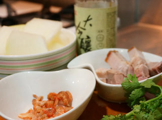 1、先将食材准备好。冬瓜切薄片,约0.3公分。脆皮烧肉可以在传统菜市场买的到,一般烧腊店也有,记得! 请老板切薄片~ 另外,香菜切的大小随意,我在印巷小馆吃到的香菜是切成细末,但因为我爱吃香菜,所以把它切1公分左右。