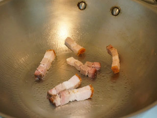 2 、热锅后加入1茶匙油,再把脆皮烧肉放下去用小火慢煎出油。印巷小馆应该是用猪皮炸到酥脆,大家也可以直接放猪皮炸出猪油,这样就一举两得啦。