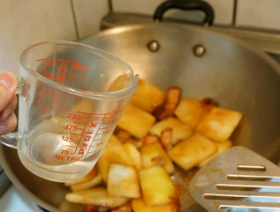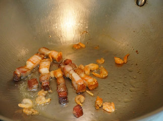 3 、脆皮烧肉煎到金黄色后加入虾米,继续拌炒约10秒。请继续维持小火。