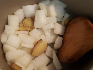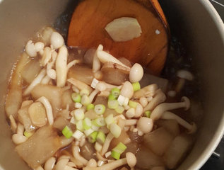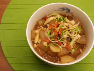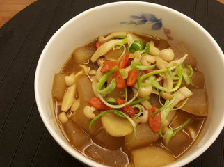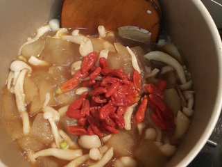 主料:冬瓜一碗,雪白菇一碗,枸杞适量,姜少许,葱一支