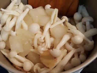 5 、放入雪白菇伴炒后, 先加入调味料, 再加入水 (可倒入枸杞水), 盖上锅盖闷煮约15分钟到冬瓜软了即可。
