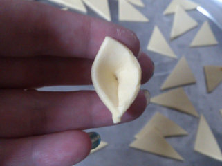 1、将起酥片切成适当大小的三,角形,我是切成16片正方形再对切成三角形,然后将三角形对折,建议不要在手上停留太久,不然接触手温太久软化后不好折,会黏手。