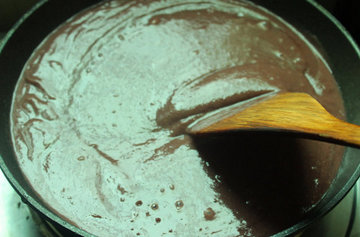 8、不停的顺时针推红豆泥,直至红豆泥变得稍作浓稠,当红豆泥在木铲上呈缓缓落下的状态即可,将红豆泥装入碗中备用。