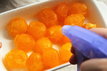 9、咸蛋黄洗净,将白酒喷洒在咸蛋黄,放进烤箱中,150度烘烤5分钟。