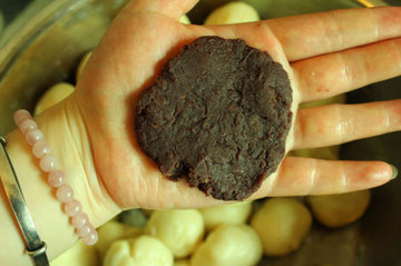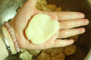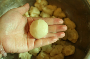 11、将红豆沙分40个,重量为25-30g豆沙馅,选取一个豆沙馅,在手心中稍作压扁。