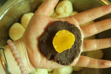 12、将咸蛋黄的刀切剖面朝上,码在豆沙馅的中间位置。
