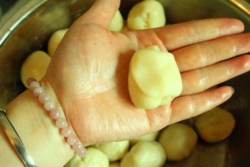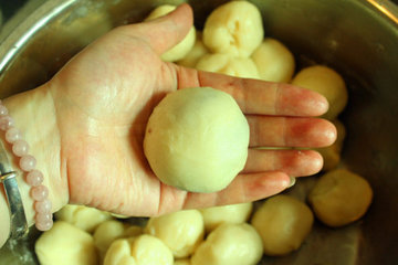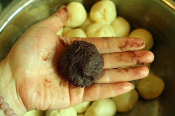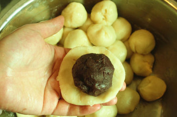 13、包起,撮圆成咸蛋黄豆沙馅,其余39个内馅用同样的方法做好。