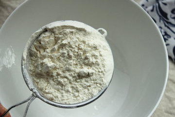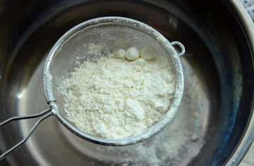 7、将低筋面粉过筛入盆中。