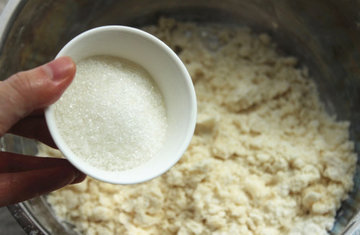 3、将面粉和猪油混合均匀,揉搓成颗粒状。