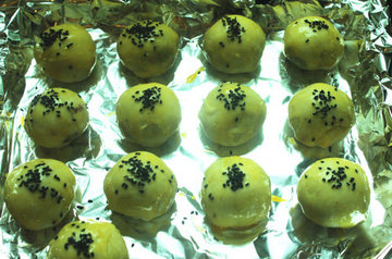 18、在蛋黄酥生胚表面撒少许黑芝麻装饰。