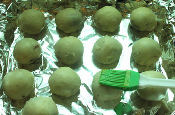 16、包起,撮圆成蛋黄酥成胚,码在烤盘上。