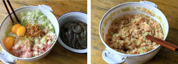 3、猪肉末加上白菜末、鸡蛋、老姜末、鸡油、胡椒末、花椒末、盐。虾去头去壳另用。