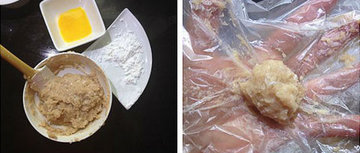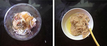 4、搅打成泥。加上一个鸡蛋的蛋清,加上小量淀粉。