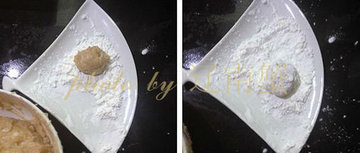 8、可以再滚一次蛋黄,再滚一次干粉。