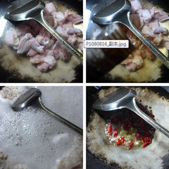 3、烧锅倒油烧热,下入花椒、干辣椒和姜末炝锅。
