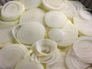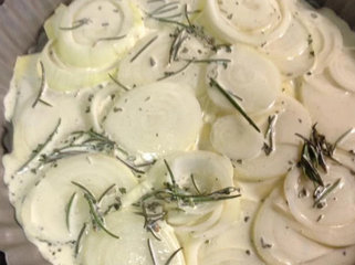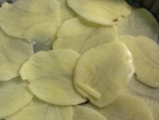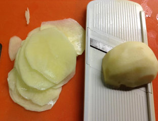 2、马铃薯刨成薄片。洋葱切薄片(切的愈薄愈好)