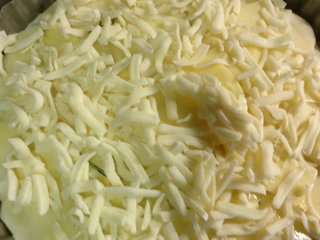 7、上面撒起司丝。放入预热250度烤箱,250度烤3分钟,220度烤10分钟,200度烤17分钟。(中途适时盖铝纸)。