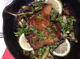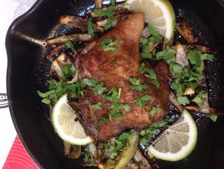 5、烤完后,继续留在烤箱中约10分钟。趁这时将香菜剁碎,柠檬切片,再摆放到锅中装饰即完成。