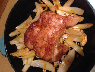 3、煎约莫2~3分钟后,稍微铺好,然后将皮朝上,鸡腿排放在洋葱上。