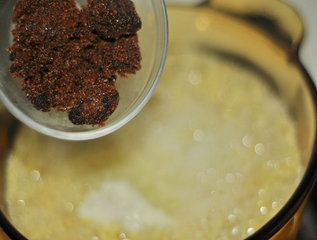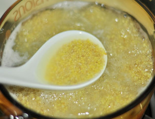 3、锅里放入泡好的藜麦和小米,加入适量的清水,煮开。转小火,不盖盖煮20分钟,至浓稠。撇去浮沫。不停的搅拌。