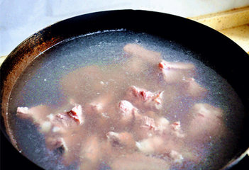 2、捞出放在开水锅里焯水几分钟,并捞出油沫和脏气,然后倒出脏水,排骨用清水清洗一下。锅内再加水烧开把排骨再次放入开水锅里焯水再清洗一次,这样可以让煲出来的汤熬出来比较白和减少汤的油腻感,同时也可以把排骨上的脏气洗去 。