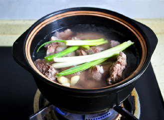3、把清洗过的排骨放在砂锅里加入热水,放入3棵撕碎的整葱段,(记住是葱段不要放葱碎,方便捞出来。)再放生姜片盖上盖子,温火烧开调至慢火慢熬,熬制汤色发白和粘稠即可。(喜欢吃比较肉质酥烂的人或家里有牙齿不好的人,此过程可以放在电压力锅内加适量水、加葱段姜片,按排骨档即可,电压力锅炖排骨水不用放的太多,但是用砂锅炖排骨,得多放些水,因为砂锅炖东西容易流失水分)。