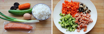 主料:米饭1碗,鸡蛋1个,香菇2朵,胡萝卜半根,黄瓜1根,烤肉适量