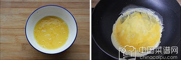 2、鸡蛋打散加入少许盐,加入1小勺水,锅里放少许油,油热后将鸡蛋下锅炒成鸡蛋碎,铲出。
