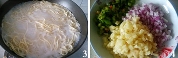 4、煮面条的过程中来处理臊子的材料,将柿子椒、洋葱、土豆切成小丁。