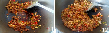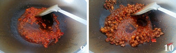 13、加入适量生抽、香醋、一丁点开水,慢慢将臊子煸炒至熟,炒出香味。