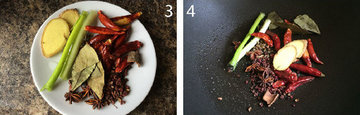 配料:香叶3片,八角5个,茴香1小撮,丁香1小撮,桂皮1块,生抽1汤匙,老抽半汤匙,盐半茶匙,料酒2汤匙,老卤1盒