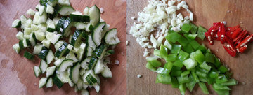 4、蒜切成碎,小红椒斜刀切成小段,青椒切成块。