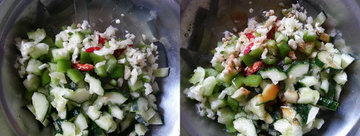 5、将黄瓜、青椒、凉粉、蒜碎、小红椒放入盆中。