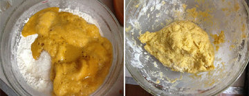 4、南瓜不要放太多,因为蒸制过程中会出现大量水,这需要更多的面粉才可揉成团,如果想吃南瓜肉多些,可用勺子将掺入少许面粉的南瓜挖入锅中煎成南瓜块。